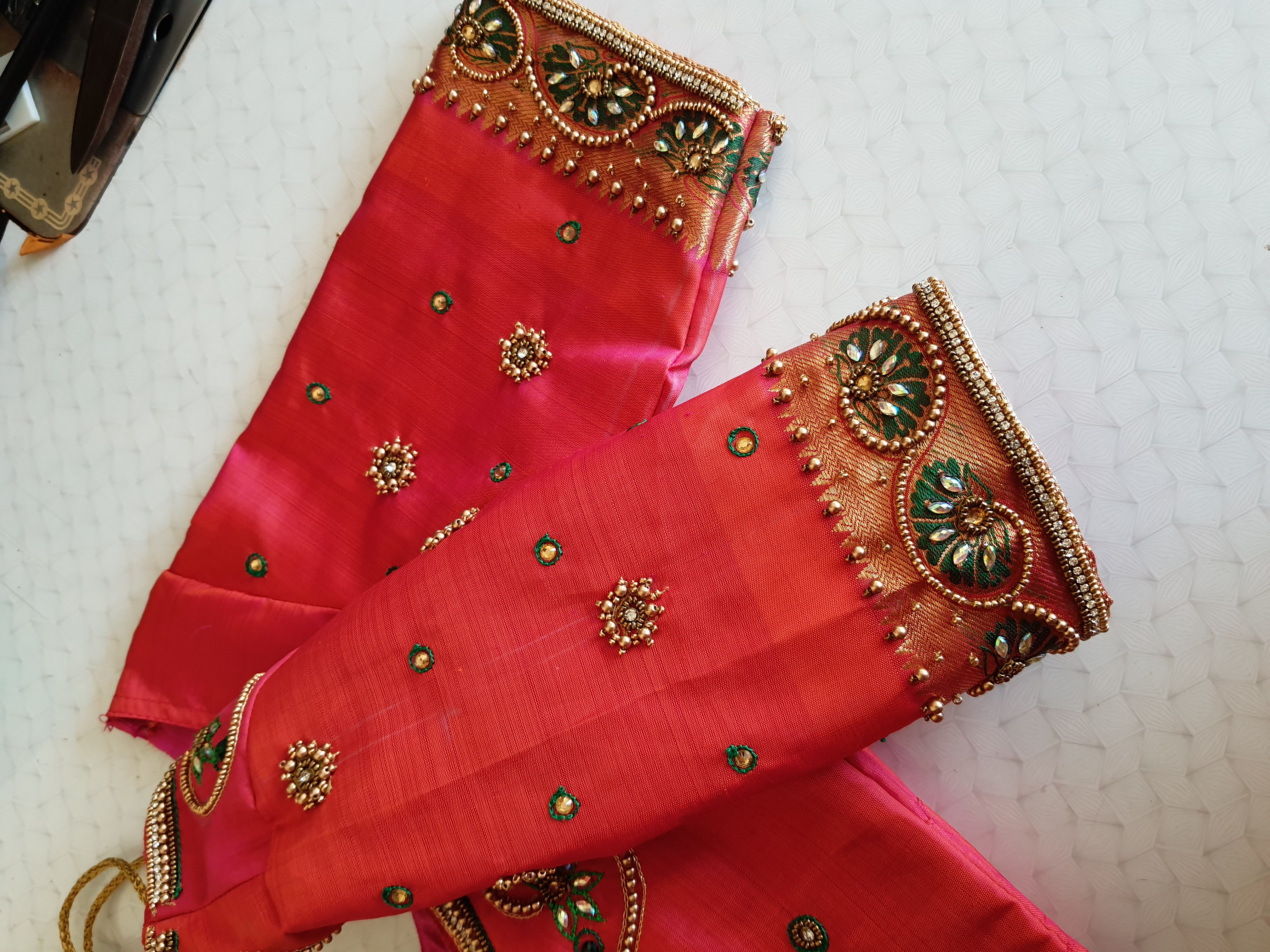 Red bridal blouse sleeve embellished with golden Aari embroidery. A rich ethnic design for brides seeking a royal traditional look.